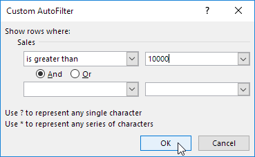 Kết quả. Excel chỉ hiển thị các hồ sơ, nơi doanh số bán lớn hơn 10.000 USD.