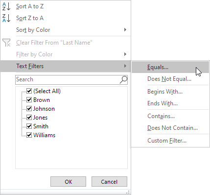 4. Nhấp vào Text Filter tùy chọn này có sẵn bởi vì Họ cột chứa dữ liệu văn bản) và chọn Equals từ danh sách.
